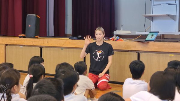 まずは自己紹介。「みさみさと呼んでください」とお伝えします。そして現役時代の動画を見せてアーティスティックスイミングの説明。近い距離で対話式で話しているので、児童たちから素朴な質問がたくさん。答えながら話を進めていきます。