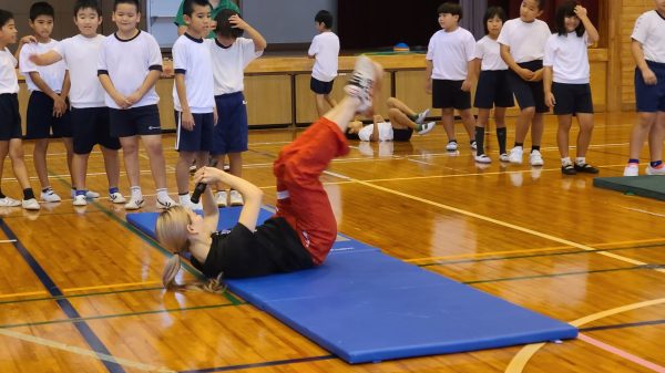 そこからスキップ、サイドステップ、かに歩き、くも歩き。児童たちは遊びのように取り組みますが、結構ハードな筋トレです。