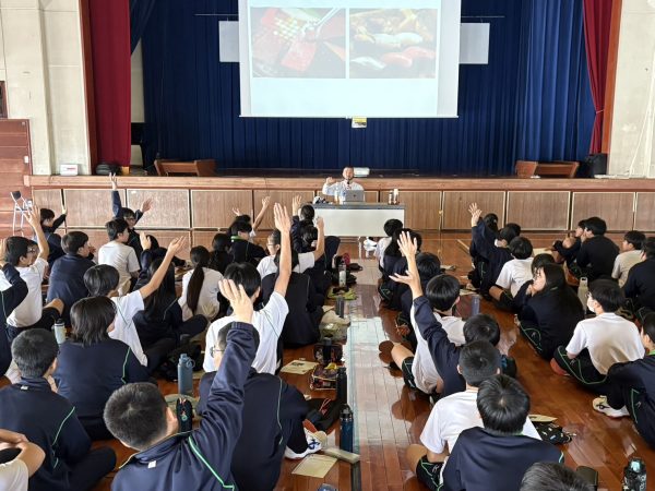 「いま焼肉と寿司、どっちが食べたい?」この質問から講話の授業が始まりました。生徒たちは楽しそうに焼肉!お寿司!と声を出しながら手をあげていきます。「そうやって自分で決めることが大事。これからたくさん選択を迫られる時が来る。その時には自分の直感を信じて突き進んでほしい。」中川さんは自分の人生を振り返りながら生徒たちへ大切な思いを伝えました。