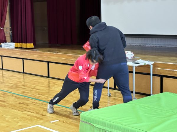 続いて実際に中村選手がタックルをする実演や、生徒が中村選手にタックルをするデモンストレーションを経て、リフトやパス&トライ、タックル、キックなどラグビーの動きをグループごとに体験しました。変則的に動くボールに苦戦したり、リフトで高く持ち上げられることに躊躇したりする生徒もいましたが、実際に経験すると、自然と全員が笑顔になっていました。